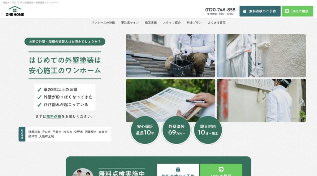 ワンホームは「寝屋川市・守口市・門真市」を中心エリアに定め、外壁・屋根の塗装を専門に取り扱っています。地元ならではの迅速な対応が可能で、近隣住民の方々にも配慮しながら作業を進める姿勢が見えます。信頼のおける“近くの職人”として、初心者にも相談しやすい特徴です。 - 無料点検サービスを提供して安心スタートを支える