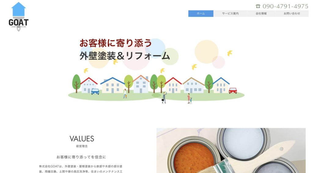 株式会社 GOAT は「お客様に寄り添う」を信念として、外壁・屋根塗装だけでなく、部分塗装・雨樋交換・高圧洗浄など住まいのあらゆる外装メンテナンスを一手に引き受けられる会社です。地元密着で小回りの利く対応、高圧洗浄を含む下地処理を重視した技術力も備えていて、美観と耐久性を両立させたい方には非常に頼もしい存在です。