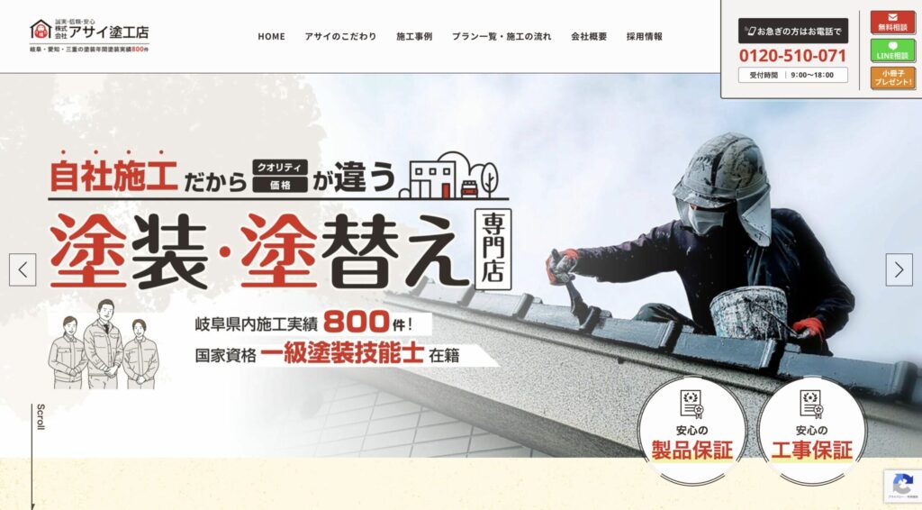 株式会社アサイ塗工店は、岐阜市を中心に地域密着で展開している外壁・屋根塗装の専門業者です。豊富な施工実績を誇り、自社施工で中間マージンを省いた明確な価格設定が特長です。