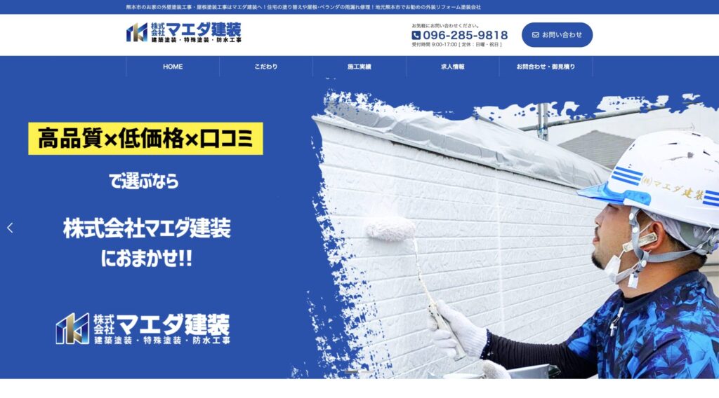 株式会社マエダ建装は熊本市を中心に外壁塗装・屋根塗装・防水工事・リフォーム全般を手がけている地元密着の塗装業者です。戸建て住宅からアパート、店舗、また屋根・ベランダの雨漏り修理まで幅広く対応。完全自社施工をモットーに高品質と低価格の両立を目指し、国家資格を持つ職人が施工の責任を担っています。