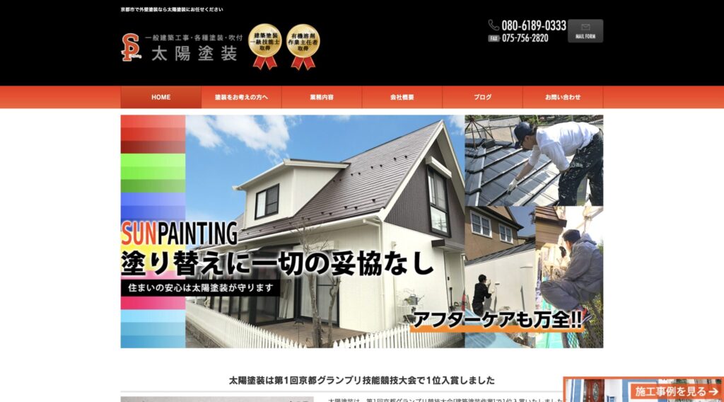 太陽塗装は、京都市を拠点に外壁塗装・屋根塗装を中心に関西一円で施工を行っている塗装会社です。建築塗装一級技能士の技術者が在籍し、第1回京都グランプリ技能競技大会で1位を獲得するなど技術力が高く評価されています。