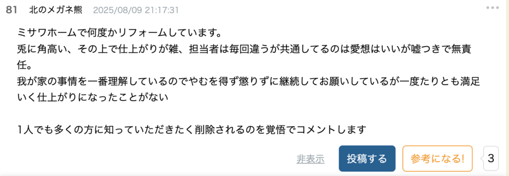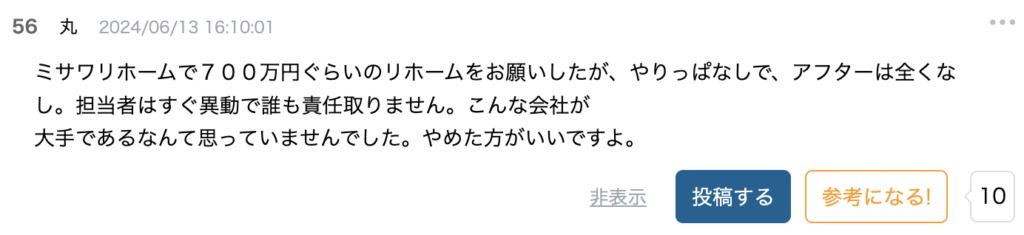 ミサワリホームで700万円ぐらいのリホームをお願いしたが、やりっぱなしで、アフターは全くなし。