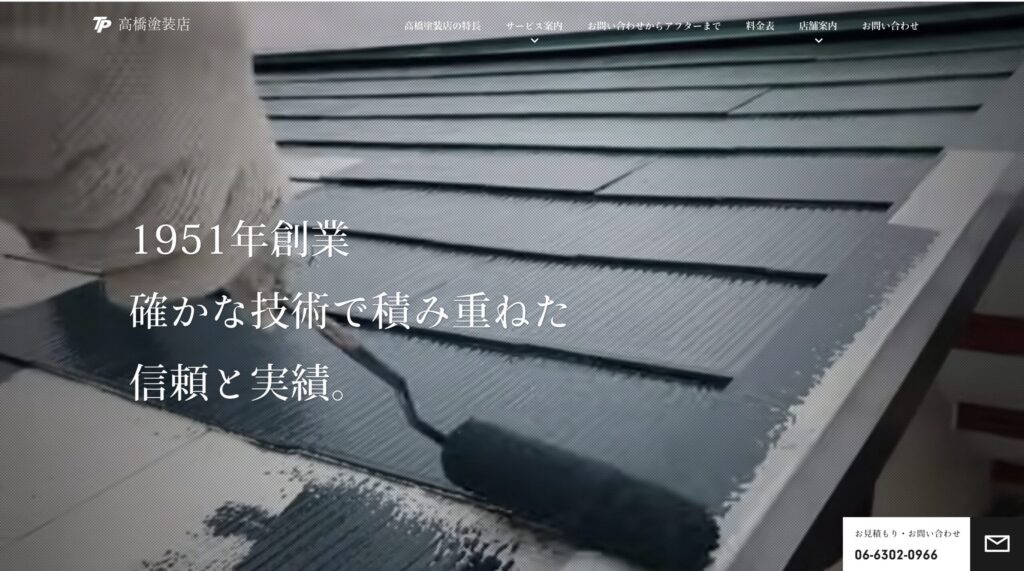 高橋塗装店(高橋ペインター) は 1951年創業の歴史ある塗装専門会社 で、大阪市淀川区を中心に阪神間エリアで外壁塗装・屋根塗装・内装塗装・防水工事を手掛けています。長年地域の住まいを守ってきた確かな実績を背景に、初めて塗装やリフォームを検討する方でも安心して相談できるサービスと丁寧な対応が魅力です。
