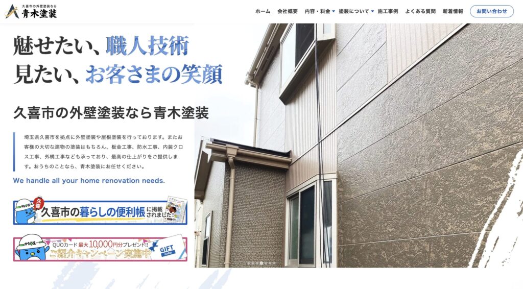 青木塗装は、埼玉県久喜市を拠点に外壁塗装や屋根塗装を手掛ける地域密着型の塗装業者です。「丁寧な施工でお客様に満足を」という理念のもと、しつこい営業を行わず、誠実な対応と高品質な仕上がりを提供しています。